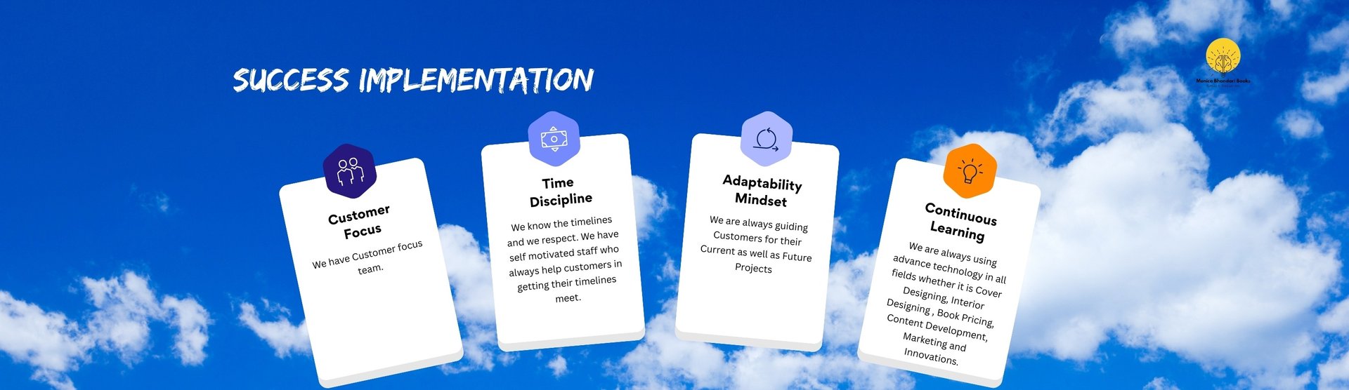 Our mission at Monica Bhandari Books is Author Empowerment through Personalized Support, Innovative Publishing Solutions, and Unwavering Dedication to Nurturing Literary Talent. From expert branding to book creation, promotion, and retail distribution, we're your trusted partners in developing and promoting your big ideas. Our team of professionals works round-the clock with you in every aspect of your publishing journey, from project development to bookstore placement, ensuring your book's success in the retail market.